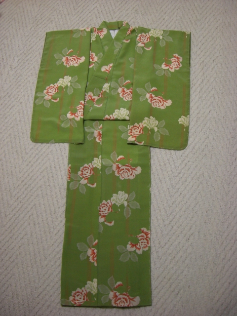 この着物、反物をヤフオクで買って、同色の八掛けをアンティーク着物屋さんに探して貰って、自分で仕立てたもの。