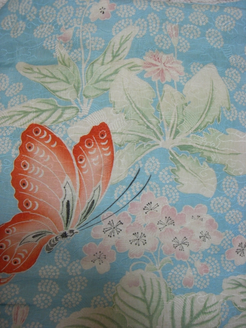 私は染めで描かれた桔梗や萩の花柄に、見えないけど透かし織りで燕が飛びまくっている、単衣のお着物です。