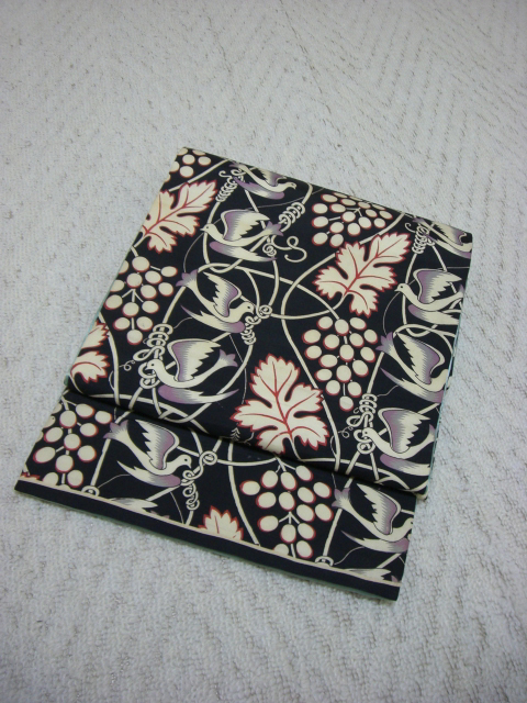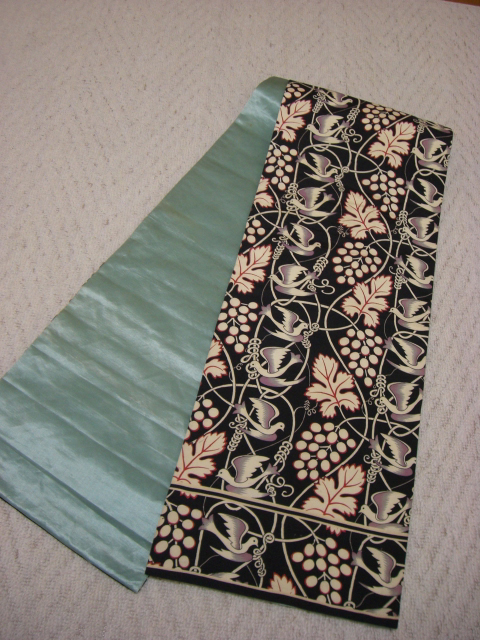 これまたアンティークの鳥と葡萄柄の羽二重と、エメラルドグリーンの繻子を合わせて、昼夜帯が出来上がる予定。