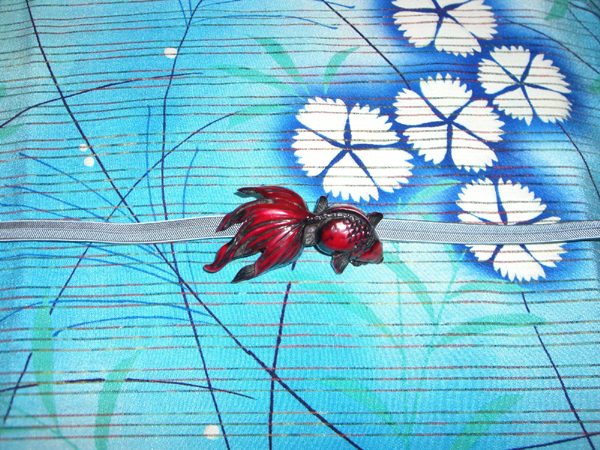 金魚の帯留は、木で彫られたモノと思われる。