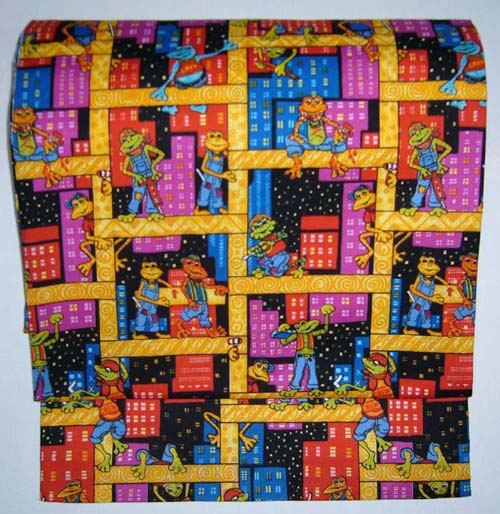 カエルの大工さんが楽しそうにマンションを建てている帯です。アメリカンなカエルさんたちの表情がかわいくて楽しくなっちゃいます。色使いもなかなか激しくて私好みだわと、一人で納得しております。