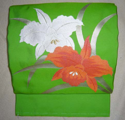 春っぽい黄緑にカトレア柄?の帯だから、これからの季節にぴったりで、早く着物を着てお出かけしたくなっちゃいます。早く春にならないかなぁ~。うみゅ~、この帯に合う着物あったかなぁ(´А`)